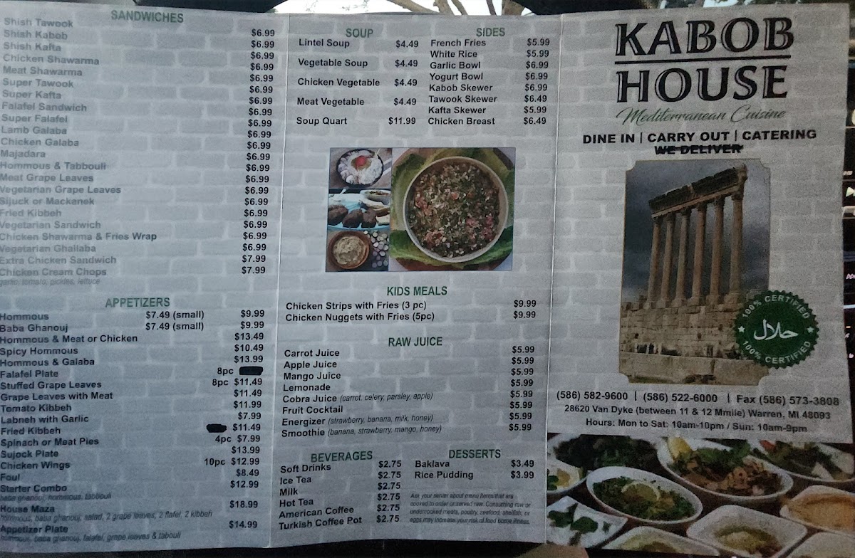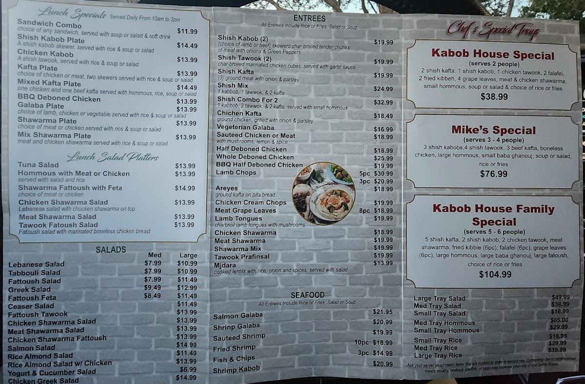 Kabob House offers a straightforward and inviting menu centered around Mediterranean flavors, perfect for those seeking casual yet satisfying meals. The food here is approachable, featuring classic dishes like chicken shawarma, fresh pita bread served with garlic dip, and flavorful salads such as tabbouleh and fattoush.